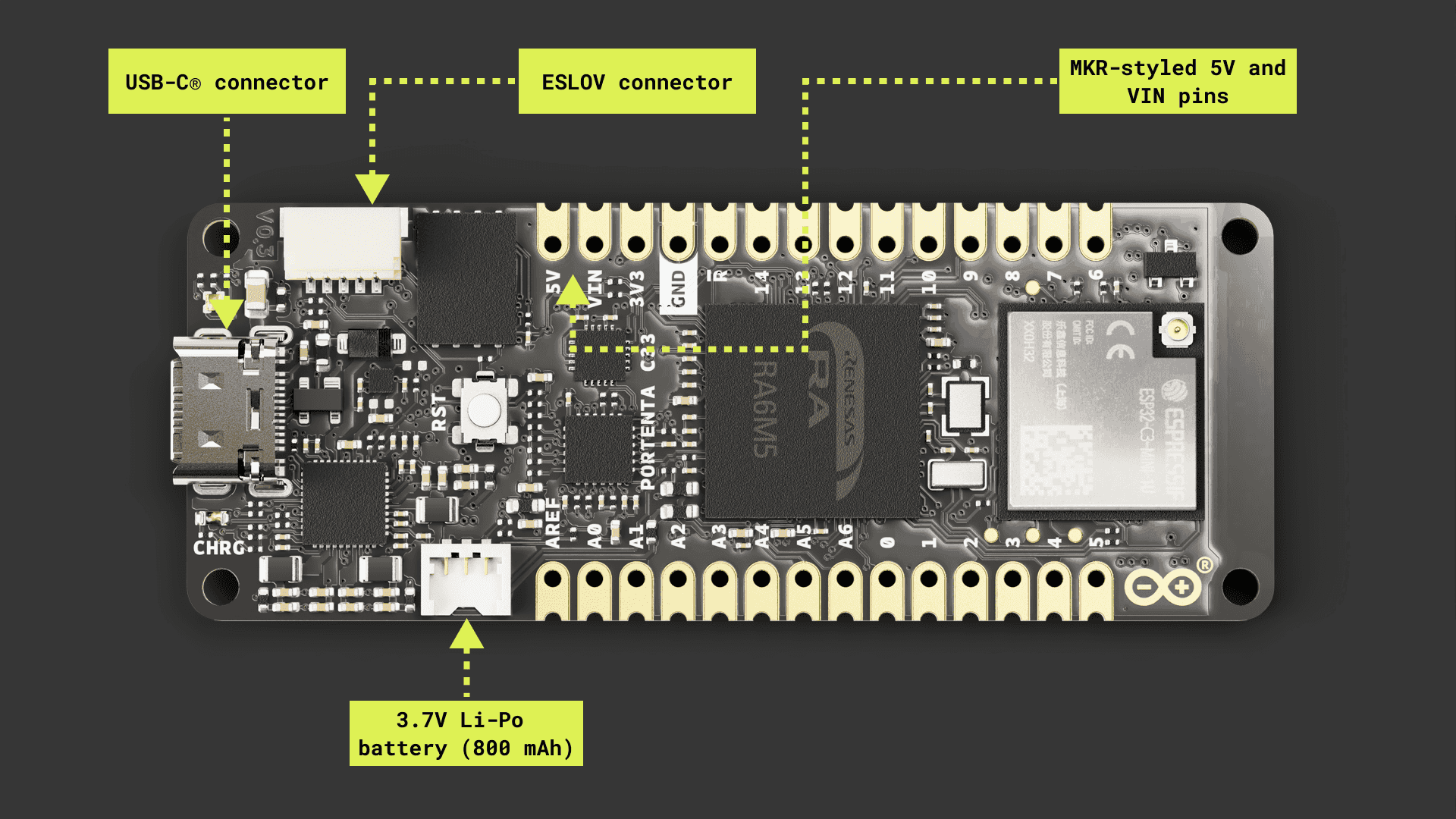 The Portenta C33 features a robust and efficient architecture that enables it for low-cost, battery-powered, IoT applications and devices.