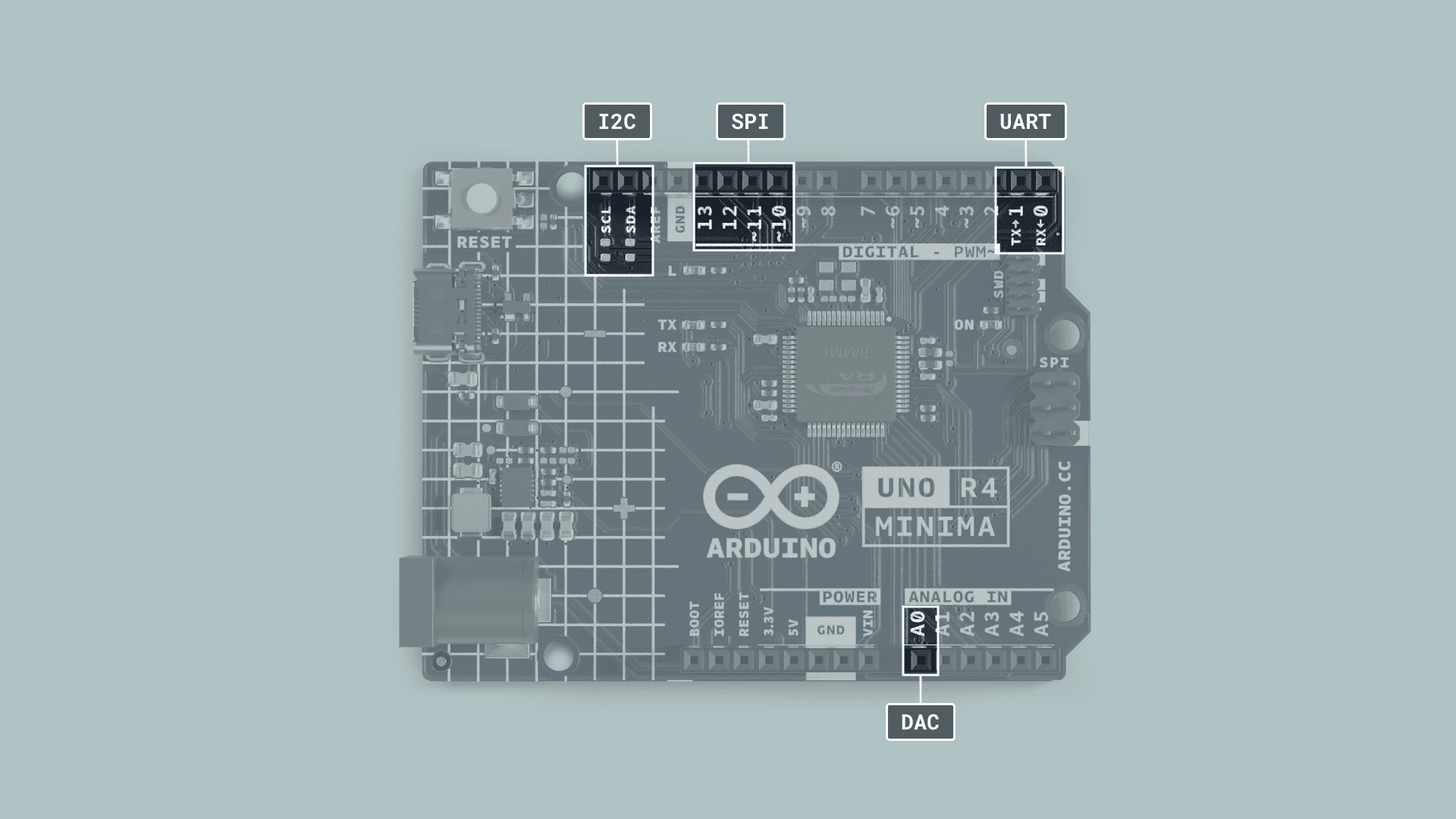 Below you can find the pinout for the Arduino UNO R4 Minima. All UNO boards largely share the placement of many pins, to make it easy for accessories to be designed for different UNO boards but if you create accessories for an older UNO be sure to check its respective pinout.