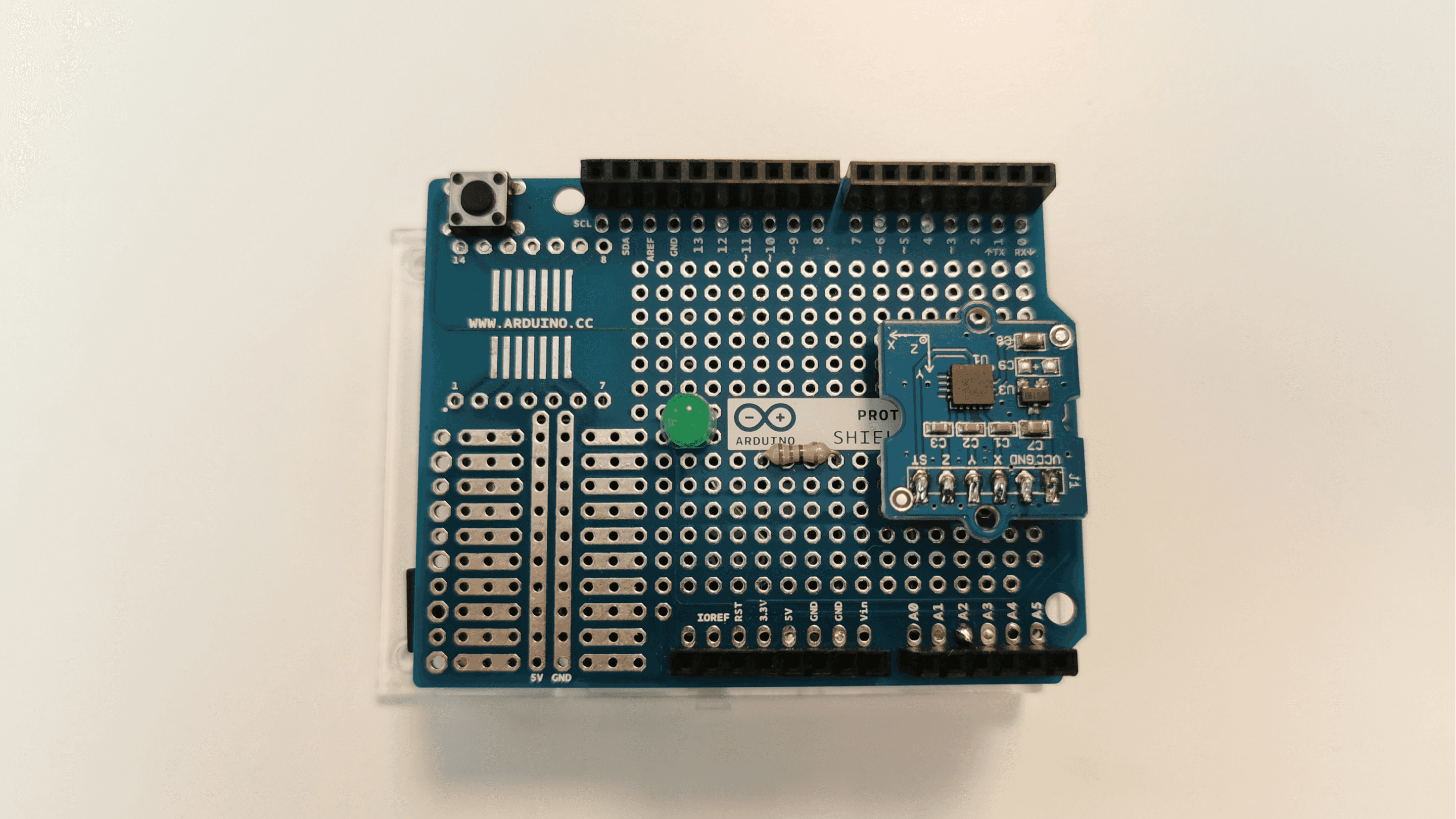 A Prototyping board. We highly recommend using the Arduino Proto Shield Rev3 (UNO Size) because it will make your life much easier. If you want you can of course use a general prototyping shield but it requires you to do some additional soldering.
